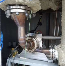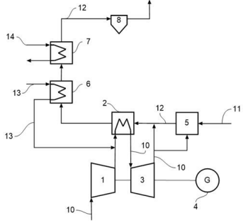 Mała elektrownia na biomasę (MEB), która została opracowana w ramach projektu POIR.04.01.04-00-0014/17 pt. „Uniwersalny Turbogazowy Układ Mikrokogeneracyjny”, przeznaczona jest dla odbiorców, którzy chcą mieć własne źródło prądu elektrycznego i ciepła, niezależne od warunków pogodowych, zasilane tanią biomasą. Oferowana moc elektryczna rzędu 30 kWe jest wystarczająca dla małych zakładów produkcyjnych, gospodarstw rolnych i większych budynków użyteczności publicznej. Działanie MEB rozpoczyna się od zasysania powietrza z otoczenia (10), które trafia do kompresora (1), gdzie jest sprężane do ciśnienia 3 barów. Następnie powietrze miesza się z podgrzaną wodą zdemineralizowaną (13), tworząc mieszaninę powietrza i pary wodnej. Mieszanina kierowana jest do wymiennika ciepła spaliny–powietrze (2), gdzie zostaje ogrzana do temperatury 800 °C przez gorące spaliny (12) z komory spalania (5). Rozgrzany gaz roboczy trafia następnie do turbiny (3), gdzie ulega rozprężeniu do 1bara i 600 °C, oddając energię mechaniczną, która napędza zarówno generator prądu (4), jak i sprężarkę (1). Po opuszczeniu turbiny, powietrze i para wodna wykorzystywane są jako utleniacz w komorze spalania (5), gdzie ulegają zmieszaniu z biomasą (11). Spaliny oddają swoje ciepło w wymienniku (2), a następnie przepływają kolejno przez podgrzewacz wody zdemineralizowanej (6) i podgrzewacz wody grzewczej (7), pozwalając na odzysk energii cieplnej w postaci gorącej wody użytkowej. Przed opuszczeniem układu spaliny są oczyszczane z cząstek stałych w elektrofiltrze (8), a następnie kierowane do komina.